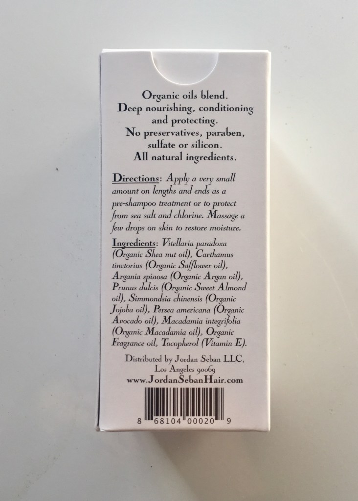 Day 1: About 10 minutes before washing my hair, I massaged a dime-sized amount into my scalp to calm my dry, slightly itchy scalp (I hadn’t washed my hair in 4 days). After washing and towel drying, I applied a dime sized amount to the middle and ends of my hair. Combed through, and let air dry. Didn’t see a difference in drying time, but ends seemed shiney, and not frizzy like my hair generally is after air drying. My scalp felt calmed, not itchy, and the roots of my hair seemed extra perky. Rubbed the excess oil in my hands on my arms – not bad.